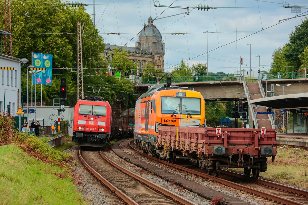 185 357-1 schleppt 265 002-6 (Voith Gravita 15L BB) aus der Zugbildungsanlage (ZBA) Halle (Saale) in südliche Richtung.