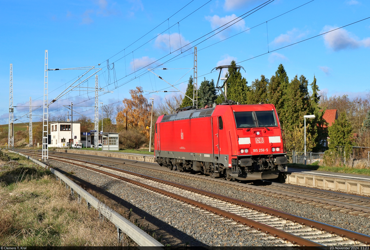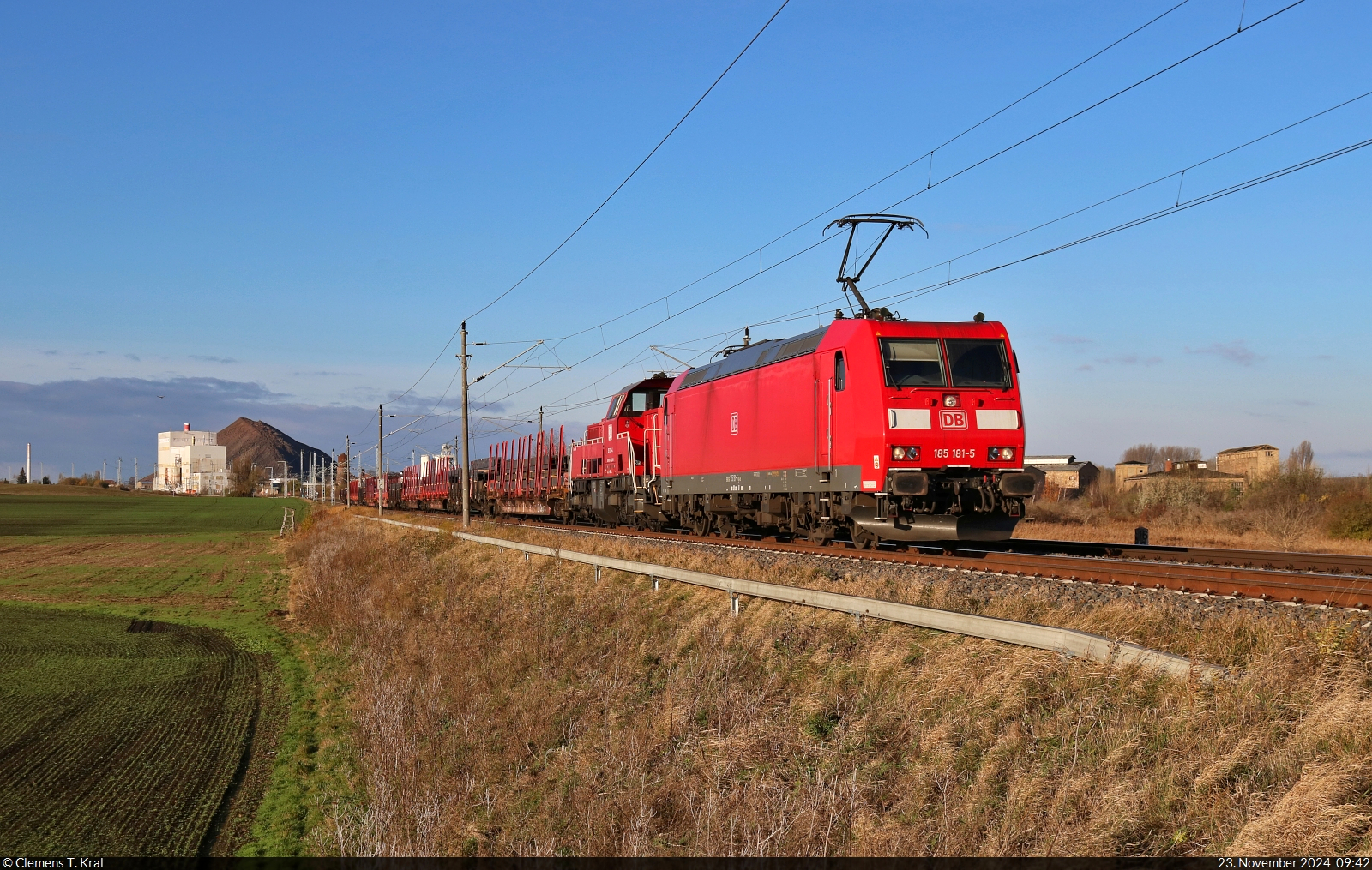 185 181-5 schleppt Stahlelemente und die kalte 261 024-4 (Voith Gravita 10 BB) bei Eisdorf (Teutschenthal) Richtung Halle Rosengarten. 🧰 DB Cargo 🕓 23.11.2024 | 9:42 Uhr