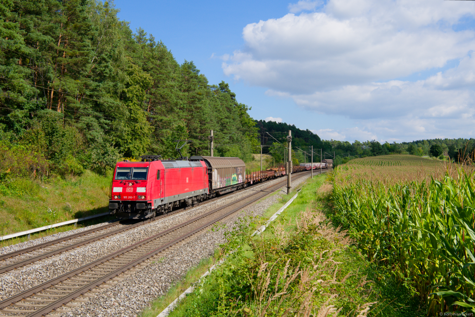 185 181-5 schleppt Stahlelemente und die kalte 261 024-4 (Voith Gravita 10 BB) bei Eisdorf (Teutschenthal) Richtung Halle Rosengarten.