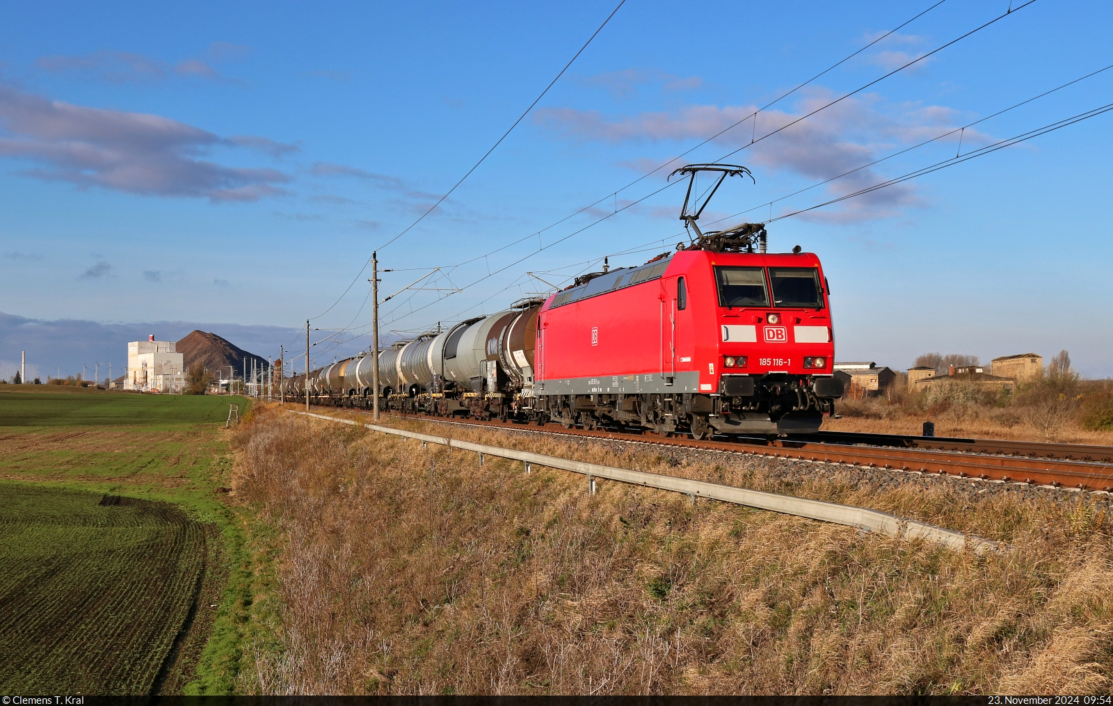 Die Schweiz-taugliche 185 116-1 transportiert Kesselwagen bei Eisdorf (Teutschenthal) Richtung Halle Rosengarten. 🧰 DB Cargo 🕓 23.11.2024 | 9:54 Uhr