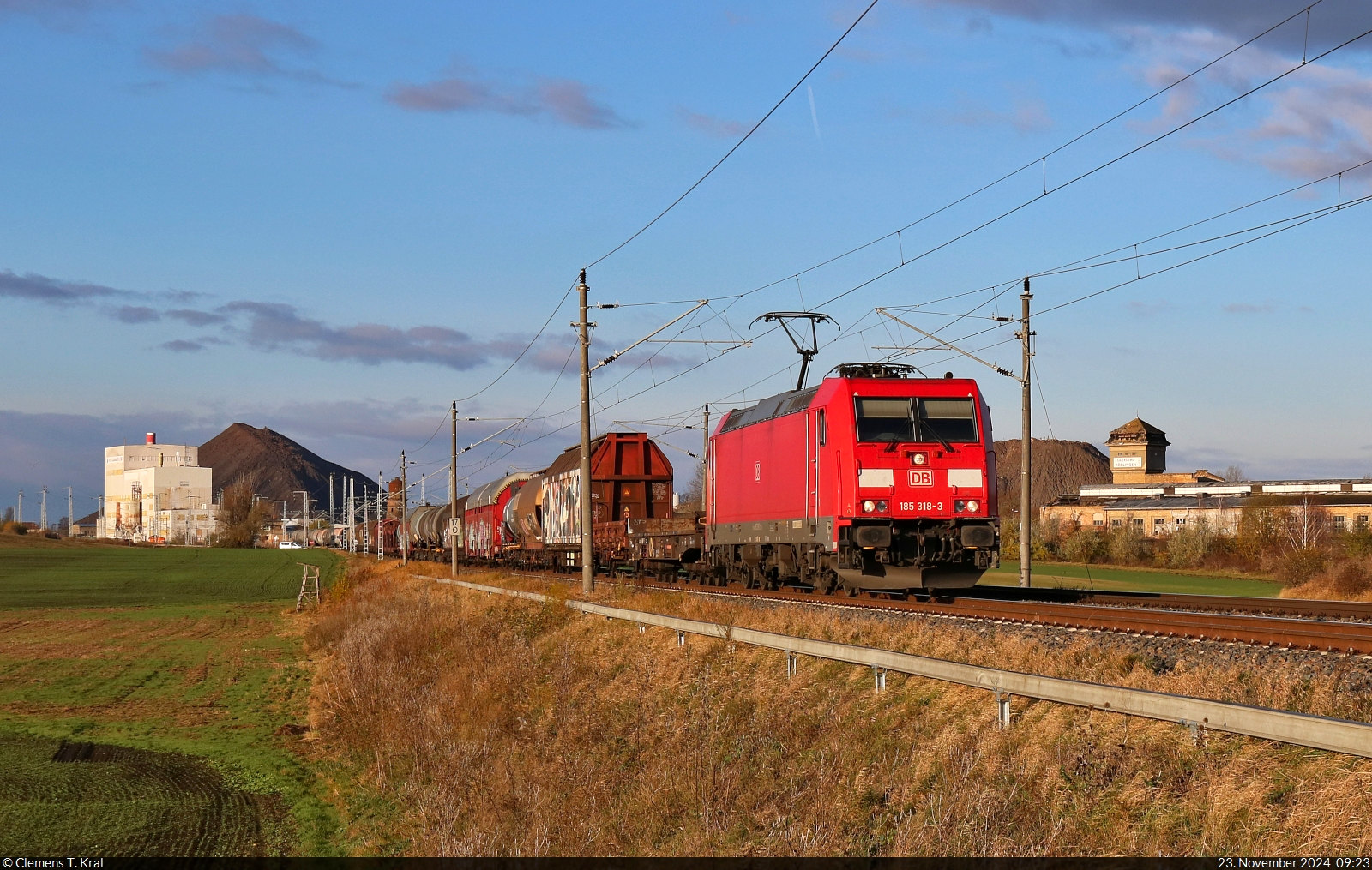 Zwischen Abraumhalde und altem Gleisbau-Schuppen: EZ mit 185 318-3 unterwegs bei Eisdorf (Teutschenthal) Richtung Halle Rosengarten. 🧰 DB Cargo 🕓 23.11.2024 | 9:23 Uhr