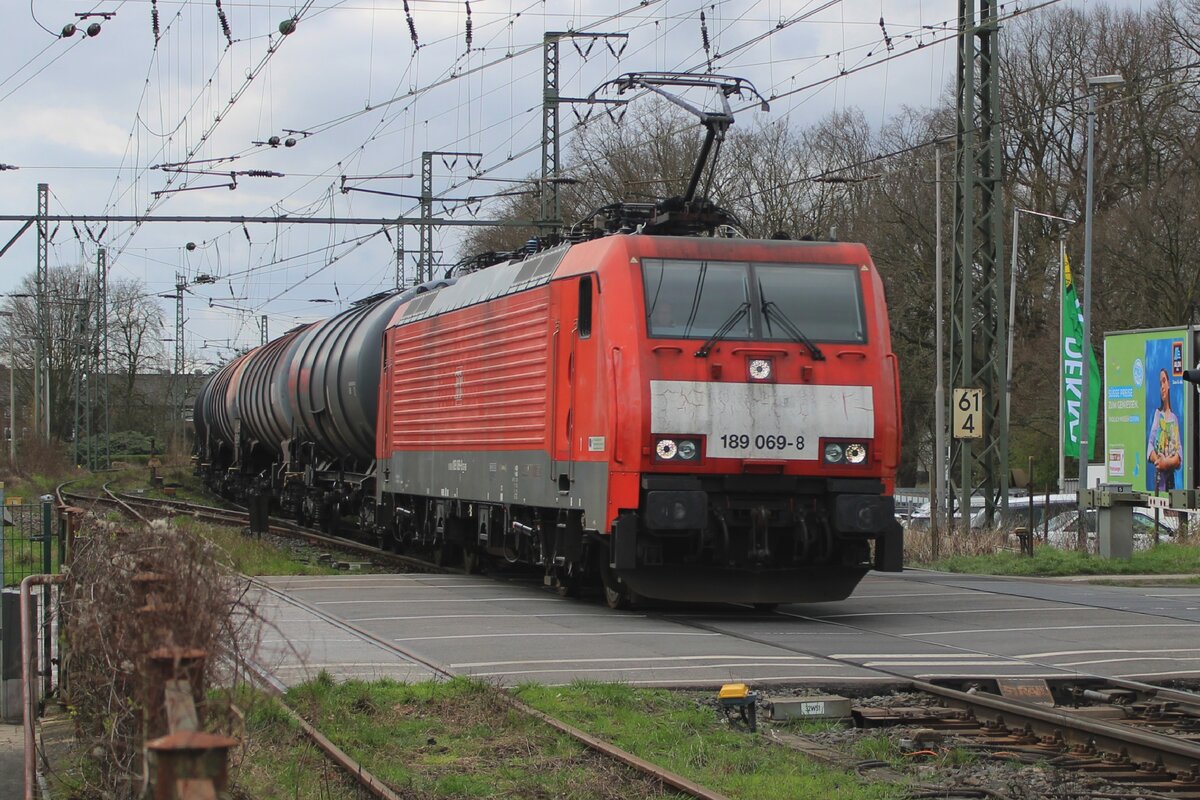 Vom hinter der Bahnübergang in Emmerich gelang am 16 März 2024 dieser Froschblick auf DBC 189 069 mit Kesselwagenzug.