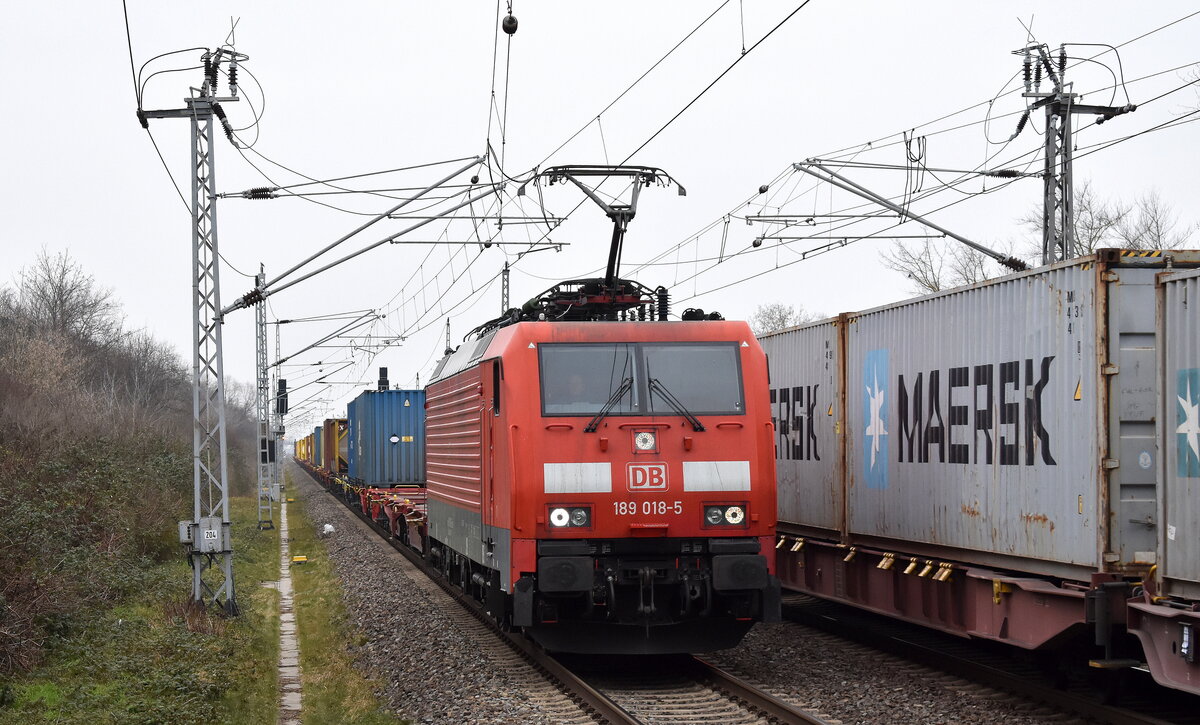 DB Cargo AG [D] mit  189 018-5  [NVR-Nummer: 91 80 6189 018-5 D-DB] und einem Containerzug  am 14.02.23 Durchfahrt Bahnhof Berlin Hohenschönhausen.