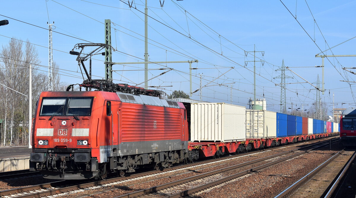 DB Cargo AG [D] mit ihrer "189 059-9" [NVR-Nummer: 91 80 6189 059-9 D-DB] und einem Containerzug am 15.02.23 Durchfahrt Bahnhof Flughafen BER Terminal 5