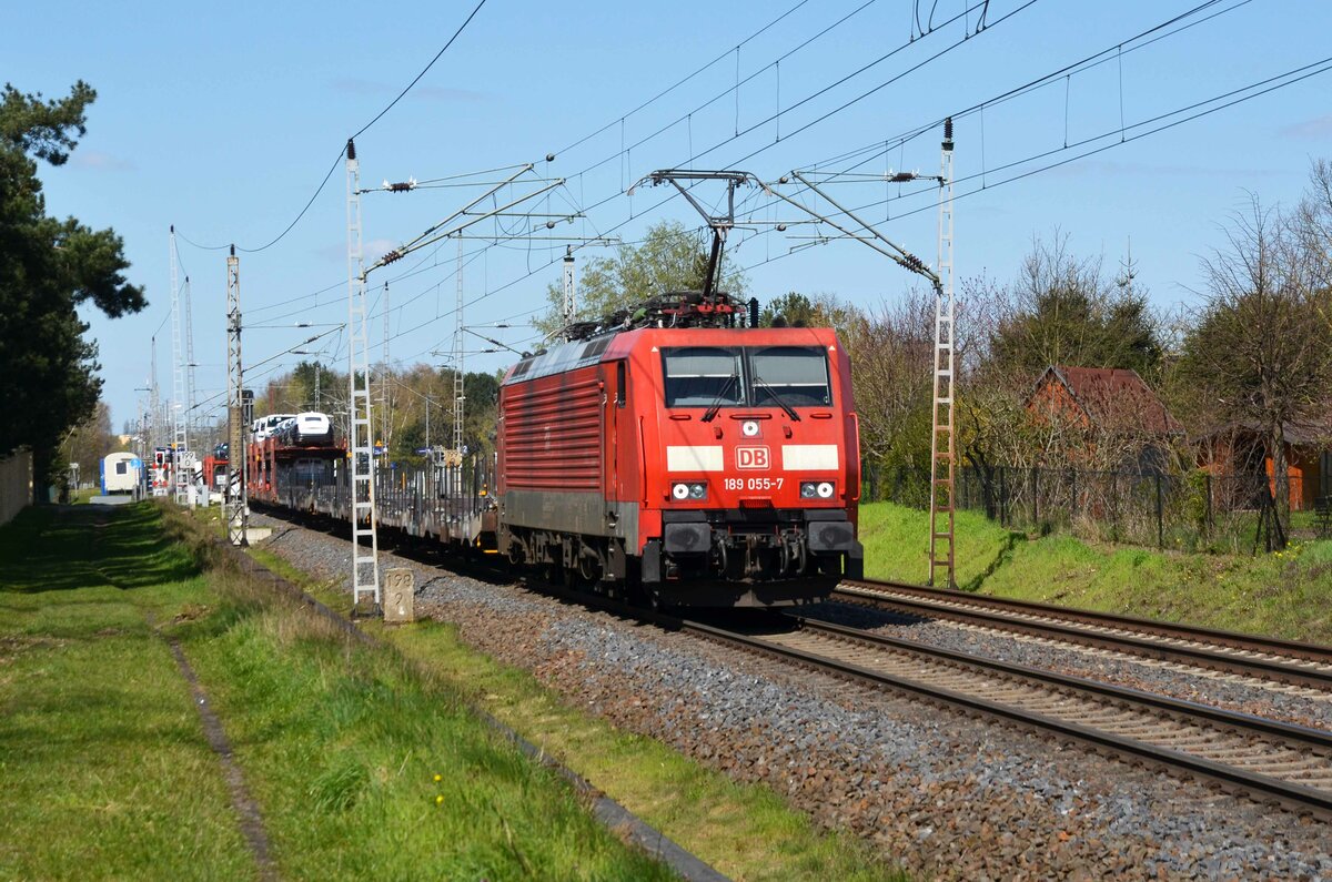 Mit einem nur teilweise beladenen Autozug rollte 189 055 am 19.04.23 durch Wittenberg-Labetz Richtung Falkenberg(E).