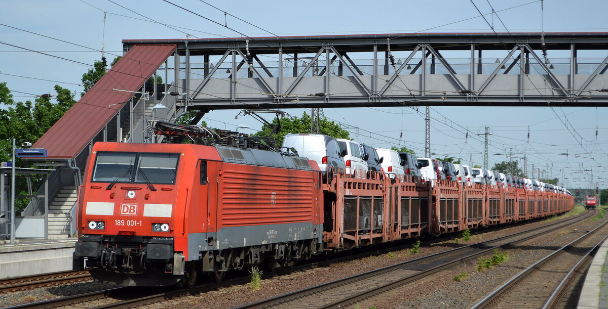 DB Cargo AG [D] mit "189 001-1" [NVR-Number: 91 80 6189 001-1 D-DB] und PKW-Transportzug hielt zum Personalwechsel einige Zeit im Bf. Saarmund, 19.05.22 Lothar Stöckmann