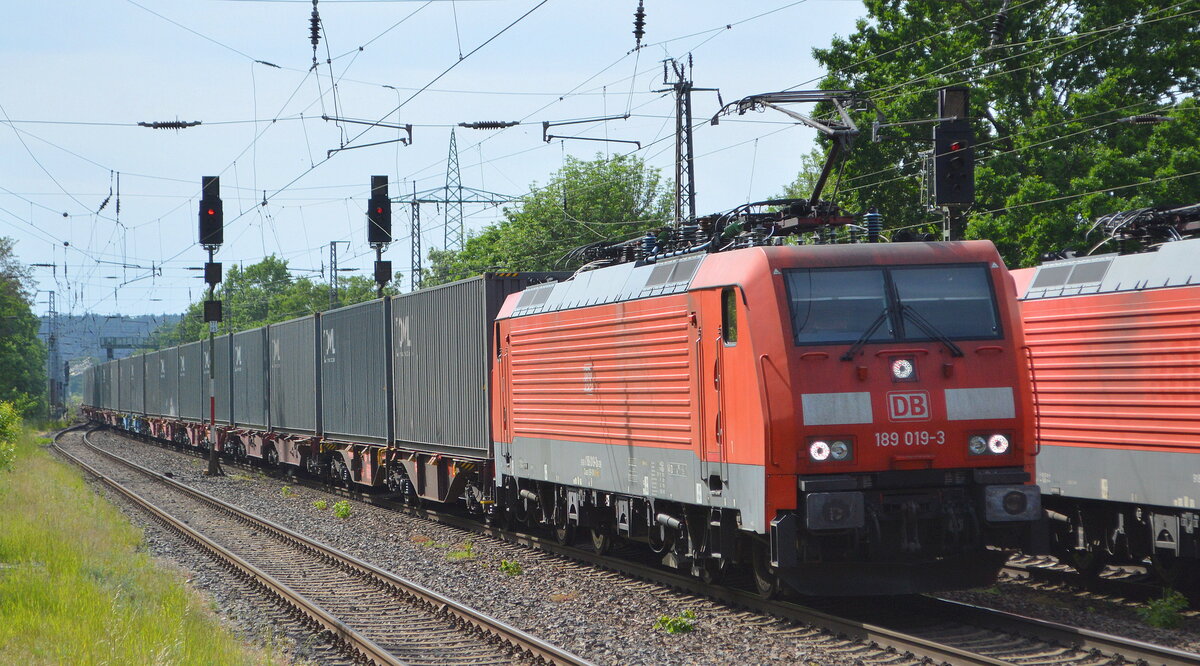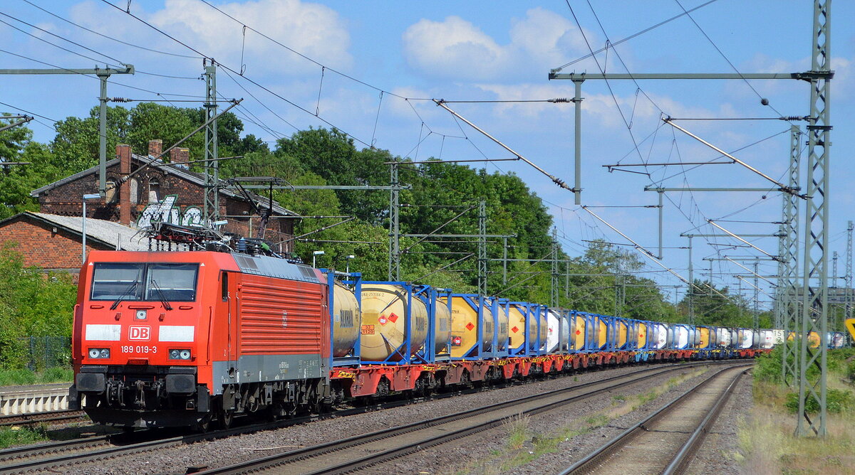 DB Cargo AG [D] mit "189 019-3" [NVR-Nummer: 91 80 6189 019-3 D-DB] und einem Tankcontainer-Ganzzug am 02.06.22 Höhe Bf. Niederndodeleben (Nähe Magdeburg). Lothar Stöckmann