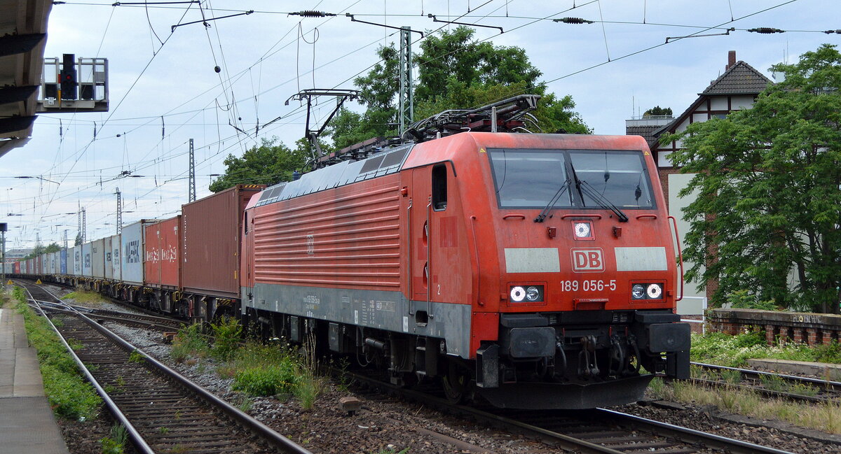 DB Cargo AG [D] mit "189 056-5" [NVR-Nummer: 91 80 6189 056-5 D-DB] und Containerzug am 29.06.22 Vorbeifahrt Bahnhof Magdeburg-Neustadt. Lothar Stöckmann