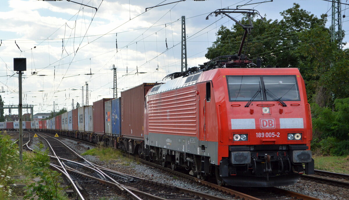 DB Cargo AG [D] mit "189 005-2" [NVR-Nummer: 91 80 6189 005-2 D-DB] und einem Containerzug am 13.07.22 Vorbeifahrt Bahnhof Magdeburg-Neustadt. Lothar Stöckmann