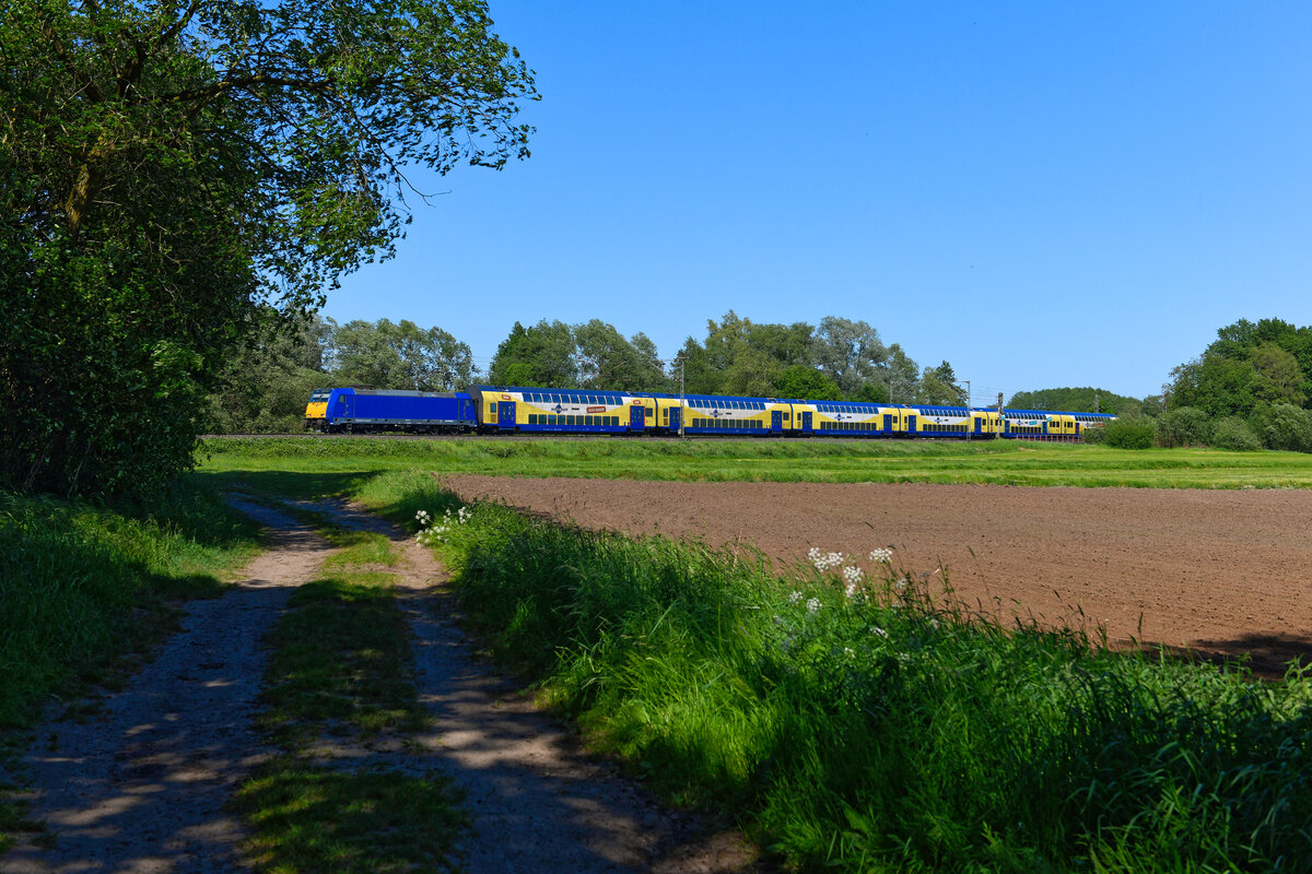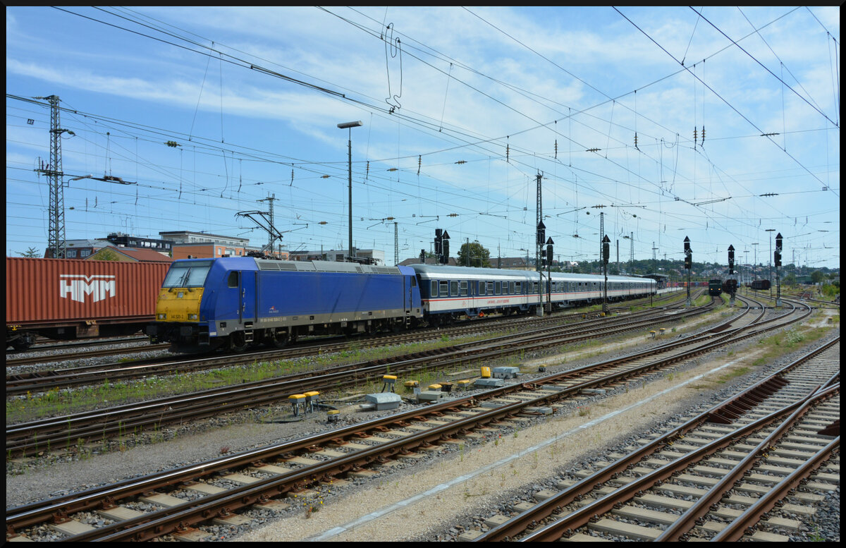 Am Rangierbetrieb, bzw. Dosto-Überführungsfahrten von TRI beteiligt sich die offenbar neu in schönem Blau lackierte und mit einem Alpenmotiv versehene 146 520-2 von SRI Rail Invest. UStronics