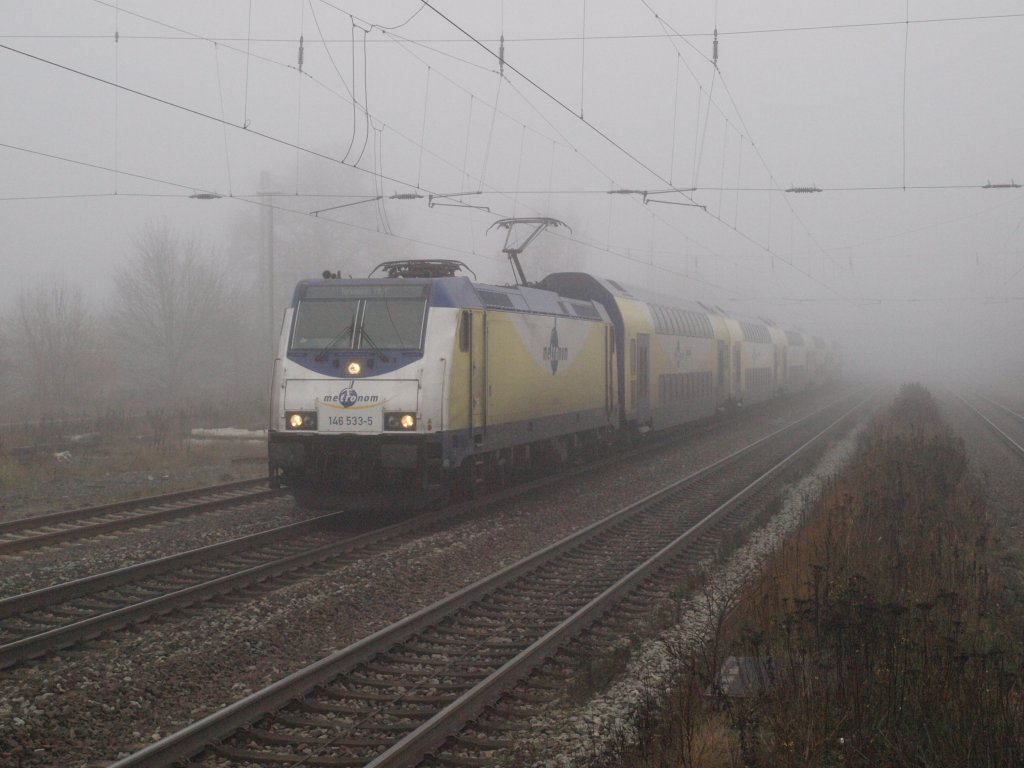 Eine sehr gedämpfte Akustik hatte der dichte Nebel zur Folge. 146 533 kommt soeben mit MEr 81914 (Hamburg Hbf - Bremen Hbf) in den Bahnhof Scheeßel geschnurrt. (24.11.2012) Carl Friedrich Moosdorf