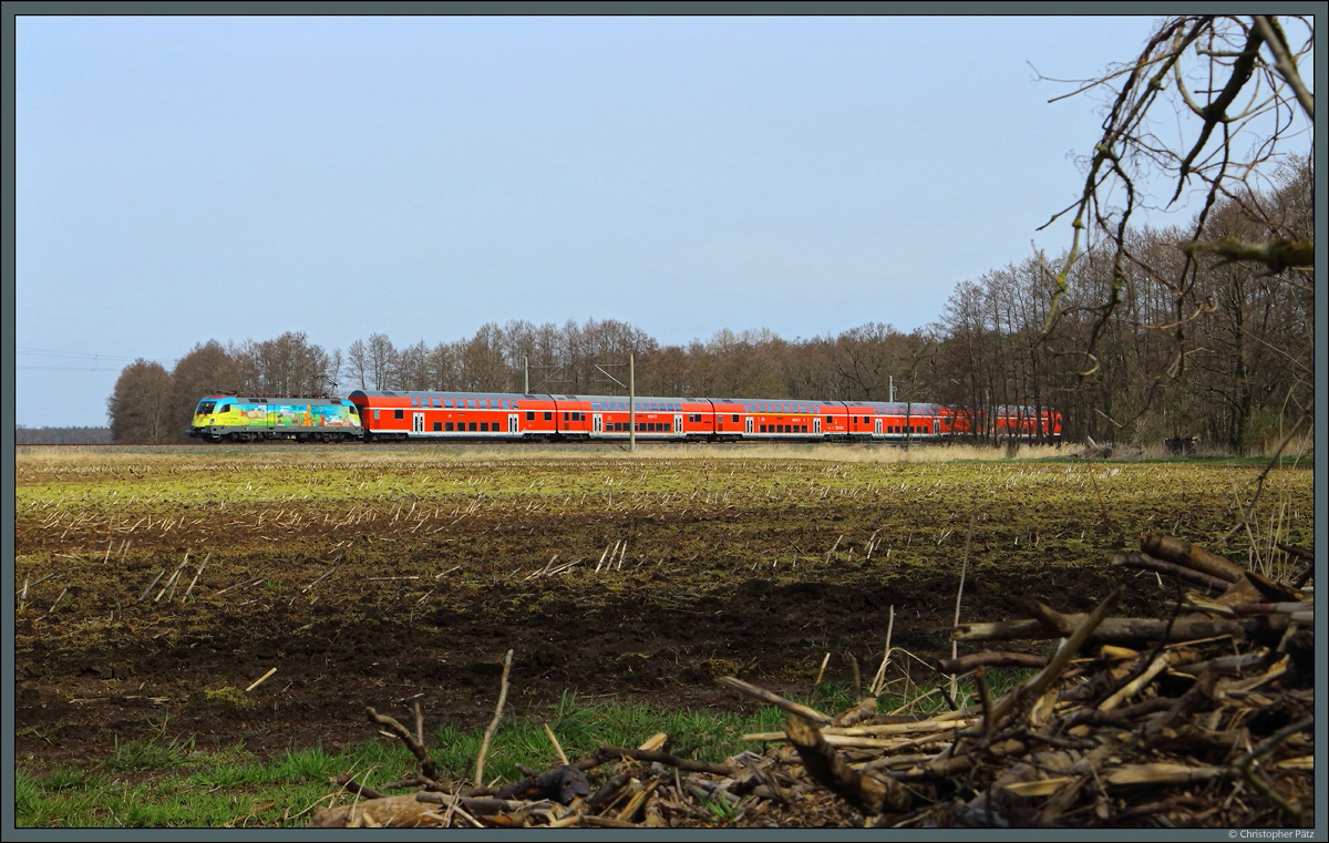 Auf alte Bekannte treffe ich in Berlin und Umgebung, wenn ich eine Lok der Baureihe 182 vor einem Regionalzug sehe. Die Inbetriebsetzung des deutschen Taurus-Derivats viel zeitlich mit meinem Einstieg in die etwas ambitioniertere Eisenbahnfotografie zusammen. Am Anfang ihrer Laufbahn waren die 182er begehrte Fotoobjekte. Die DB hatte relativ spontan 25 Stück dieser Loks beschafft, da die Baureihe 152 überraschenderweise keine Österreich-Zulassung erhielt. Von der damaligen Heimatdienststelle Nürnberg aus fanden die Einsätze primär in Richtung Alpenrepublik statt, oft in Richtung Brenner und in Doppeltraktion. Gegen 2010 wandelte sich das Einsatzgebiet der Baureihe 182 jedoch komplett. Statt schwerer Güterzüge auf Alpenpässen wurden nun schnelle Regionalzüge in Ostdeutschland bespannt. Die 182 009 befand sich zum Aufnahmezeitpunkt im 22. Dienstjahr, als ich sie am 29. Februar 2024 mit dem RE 3122 nach Cottbus Hbf beim Überqueren der Spree in Berlin Spindlersfeld fotografierte. Christoph Schneider