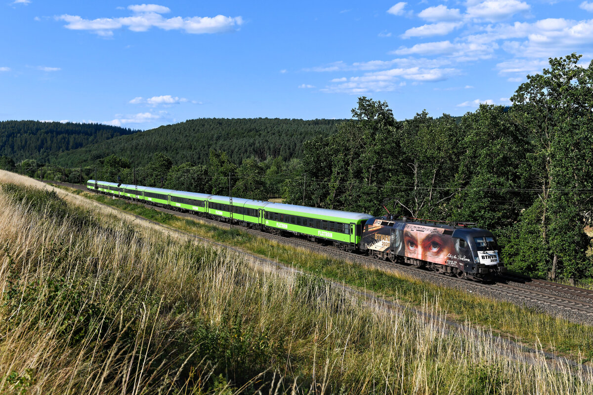 Mit einer Ladung fabrikneuer G-Klassen von Mercedes-Benz für den Export nach Übersee war am Morgen des 21. Juni 2025 der "Beethoven-Taurus" unterwegs. Unter der Zugnummer DGS 48936 war der Laufweg von Graz Ost nach Bremerhaven Speckenbüttel. Die inzwischen zum Bestand von Beacon Rail Leasing gehörende 182 510 war zum Aufnahmezeitpunkt für die Steiermarkbahn im Einsatz, unter deren Regie diese Leistung erbracht wird. Bei Odensachsen im osthessischen Haunetal konnte ich den einheitlich beladenen Autotransportzug in seiner gesamten Länge dokumentieren. Christoph Schneider