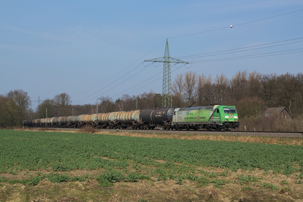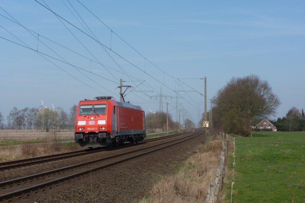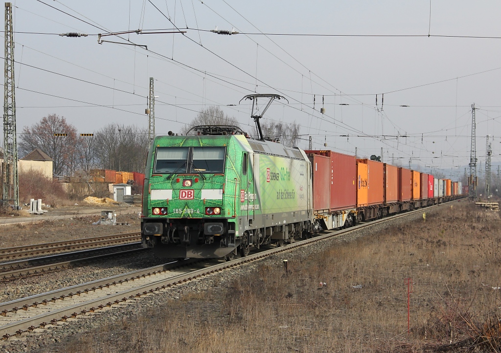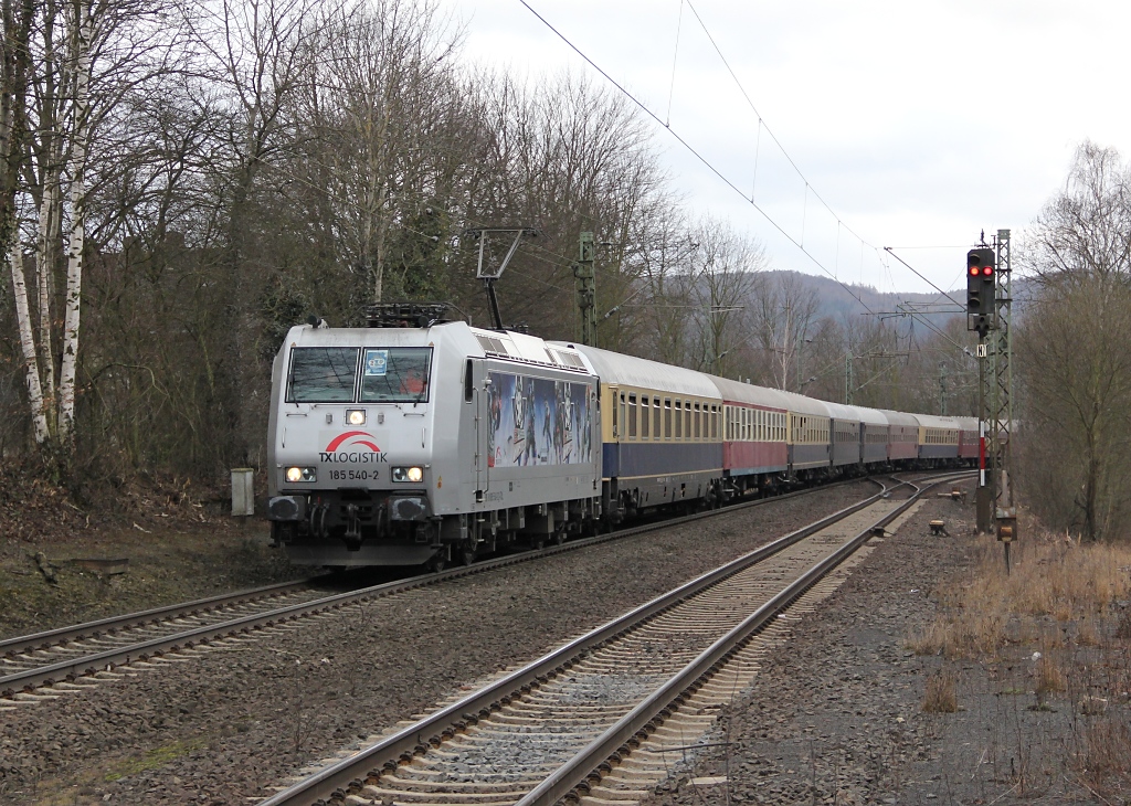 Mit lautem Pfiff setzte 185 540-2 ihre Fahrt mit dem Kassel-Huskies Sonderzug von Kassel nach Halle nach längerem Halt in Witzenhausen dann fort. Dieser Zug ist ein echter Gewinn für das Fotoalbum, wenn das Spiel auch letztlich für die Huskies nicht gut ausging. Aufgenommen am 11.03.2012. Jens Baumhauer