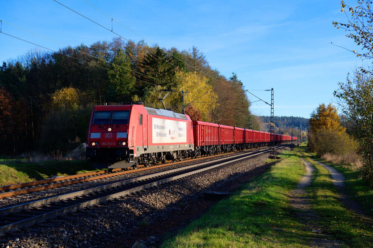 DB Cargo Werbelok 185 367-0 "Günni" fährt mit ihrem gemischten Güterzug in Richtung Ansbach.