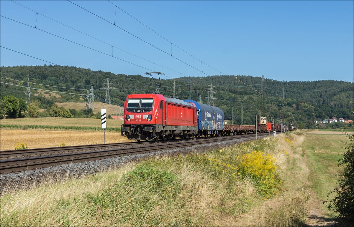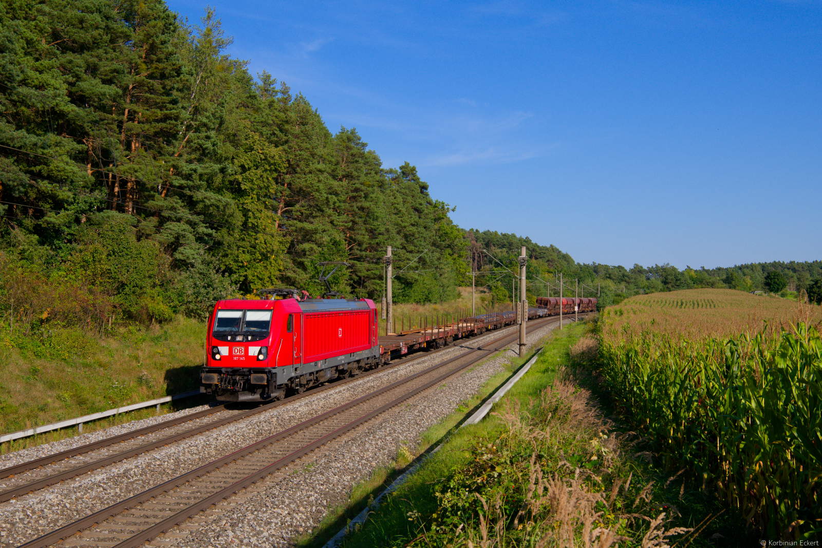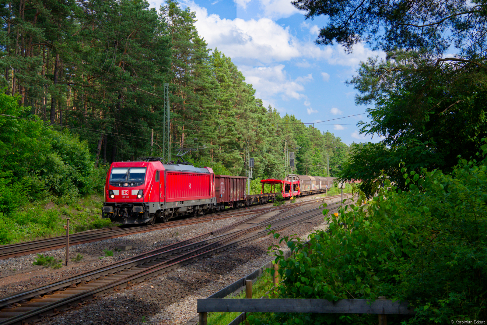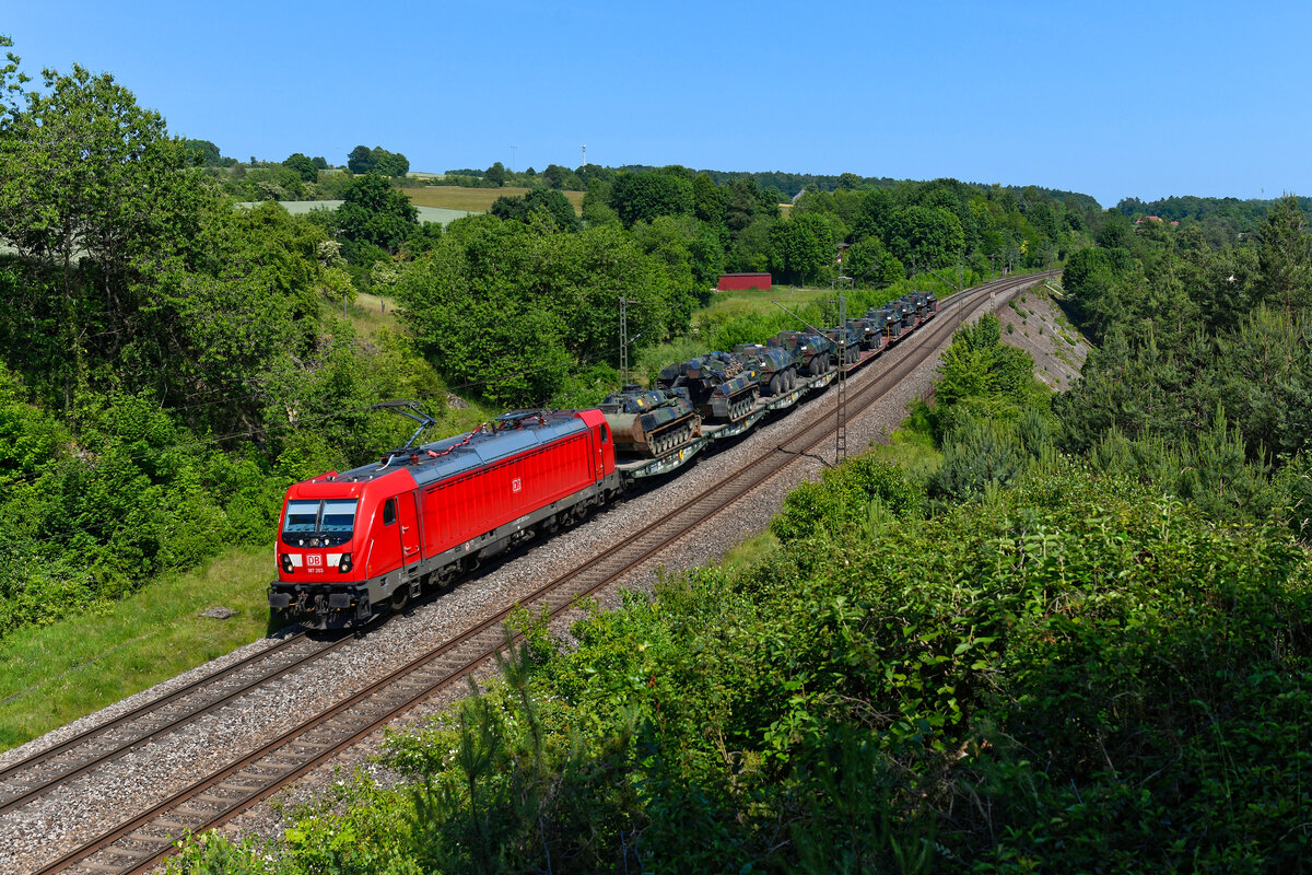 Eine interessante Leistung gab es am Nachmittag des 13. Juni 2025 bei Laaber in der Oberpfalz zu beobachten. Die 187 203 von DB Cargo fuhr mit einer Ladung "Männer-Spielzeug" in Richtung Nürnberg. Mit meinen bescheidenen Kenntnissen auf diesem Gebiet konnte ich zumindest den Pionierpanzer Dachs und den Transportpanzer Fuchs als Ladegut identifizieren. Bemerkenswert auch die ersten vier Waggons. Die Schwerlast-Flachwagen gehören zum eigenen Bestand der Bundeswehr. Christoph Schneider