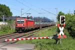 Eine unerkannt gebliebene 187 bewegt eine Einzelwagen-Leistung (EZ) bei Halle-Wörmlitz über die Saale Richtung Halle Rosengarten.