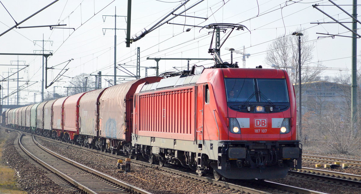 DB Cargo Deutschland AG mit "187 107" [NVR-Number: 91 80 6187 107-8 D-DB] mit gemischtem Güterzug am 28.02.19 Bf. Flughafen bErlin-Schönefeld. Lothar Stöckmann