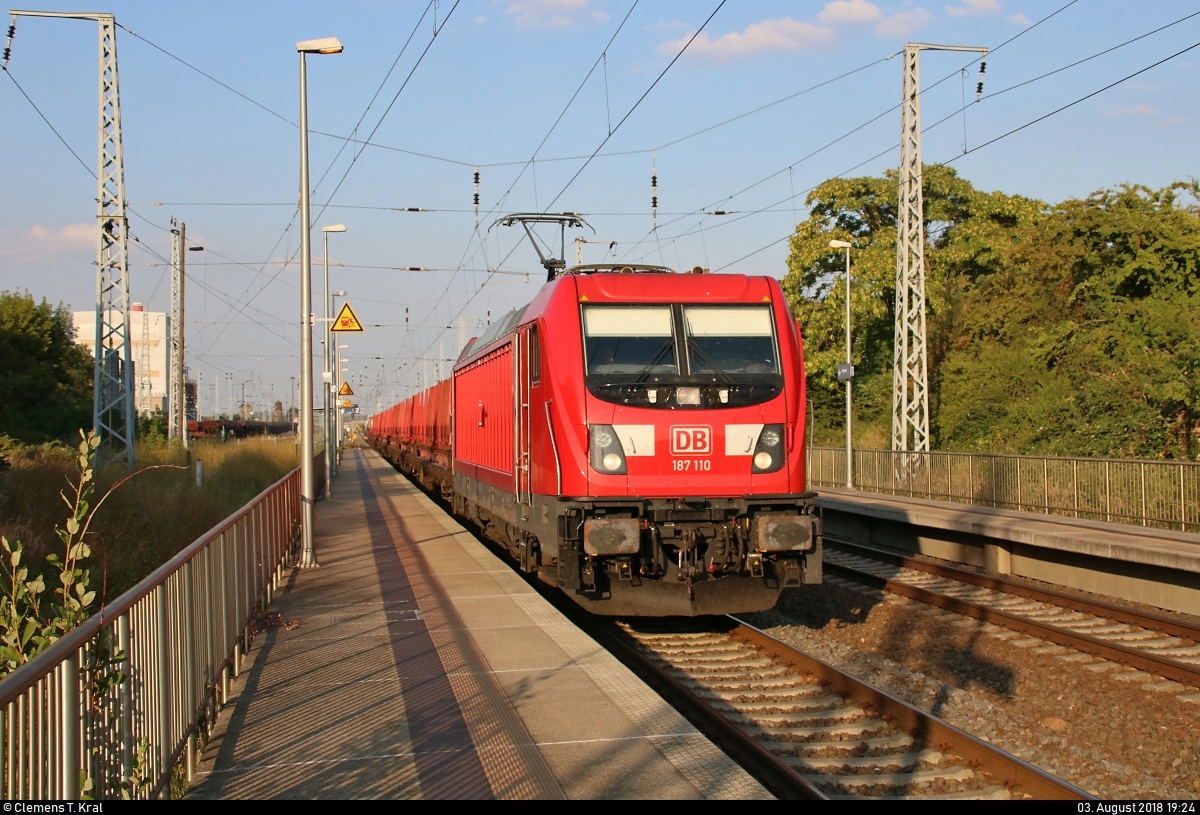 Gemischter Gz mit 187 110 DB durchfährt den Bahnhof Teutschenthal auf der Bahnstrecke Halle–Hann. Münden (KBS 590) Richtung Sangerhausen.