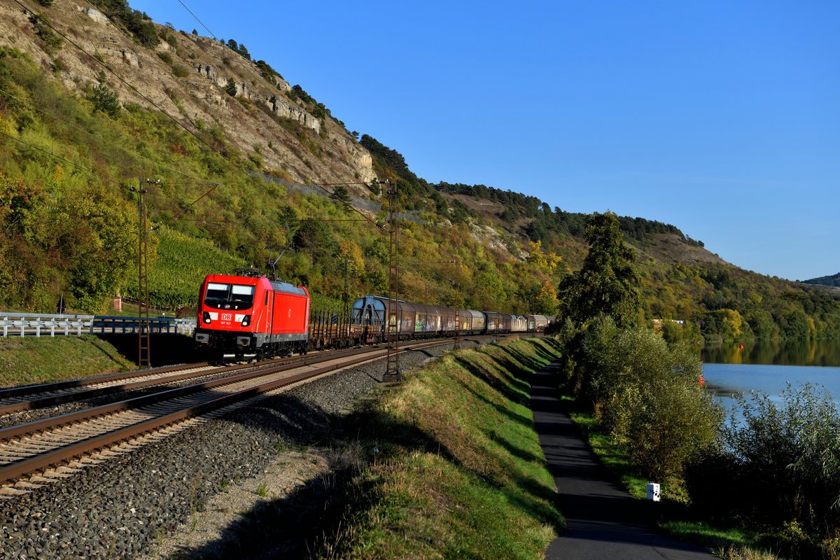 Am 05. Oktober 2018 konnte der EZ 51187 von Seelze Mitte nach München Nord Rbf zur Planzeit im Maintal beobachtet werden. Als Zuglok fungierte die noch im Neuzustand befindliche 187 141. Die Aufnahme entstand in der Nähe der Staustufe Harrbach. Christoph Schneider