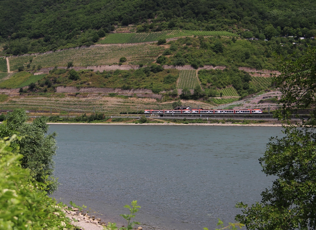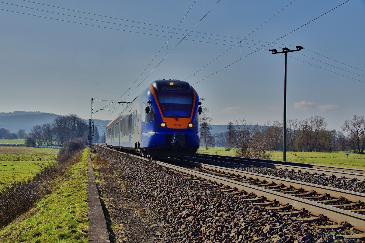 Parallel-Einfahrt nach Eichenberg: links 185 510-5 der Metrans mit Containerzug in Richtung Norden und daneben der Cantus Flirt 427 556 als R7 nach Göttingen. Aufgenommen am 24.07.2014. Jens Baumhauer