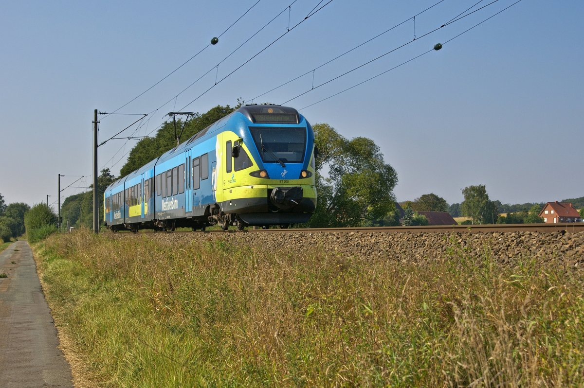 Am Ortsrand von Hasbergen begegnet der ET Sonderzug zum Haller Willem mit Lok V 65001 von ODF am 5.5.2016 um 08.25 Uhr dem nach Münster ausfahrenden ET 007 der Westfalenbahn. Gerd Hahn