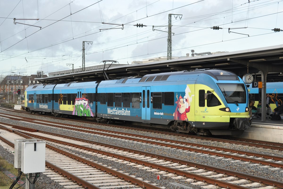 Westfalenbahn ET 009 Flirt 3-teilig 0427 117-7 + 0827 117-3 + 0427 617-6 (Bj. 2007, Stadler) als WFB 90662 Paderborn - Herford, KBS 405 Paderborn - Herford, fotografiert bei der Einfahrt in den Bf. Sylbach am 28.12.2014 Frank Grohe