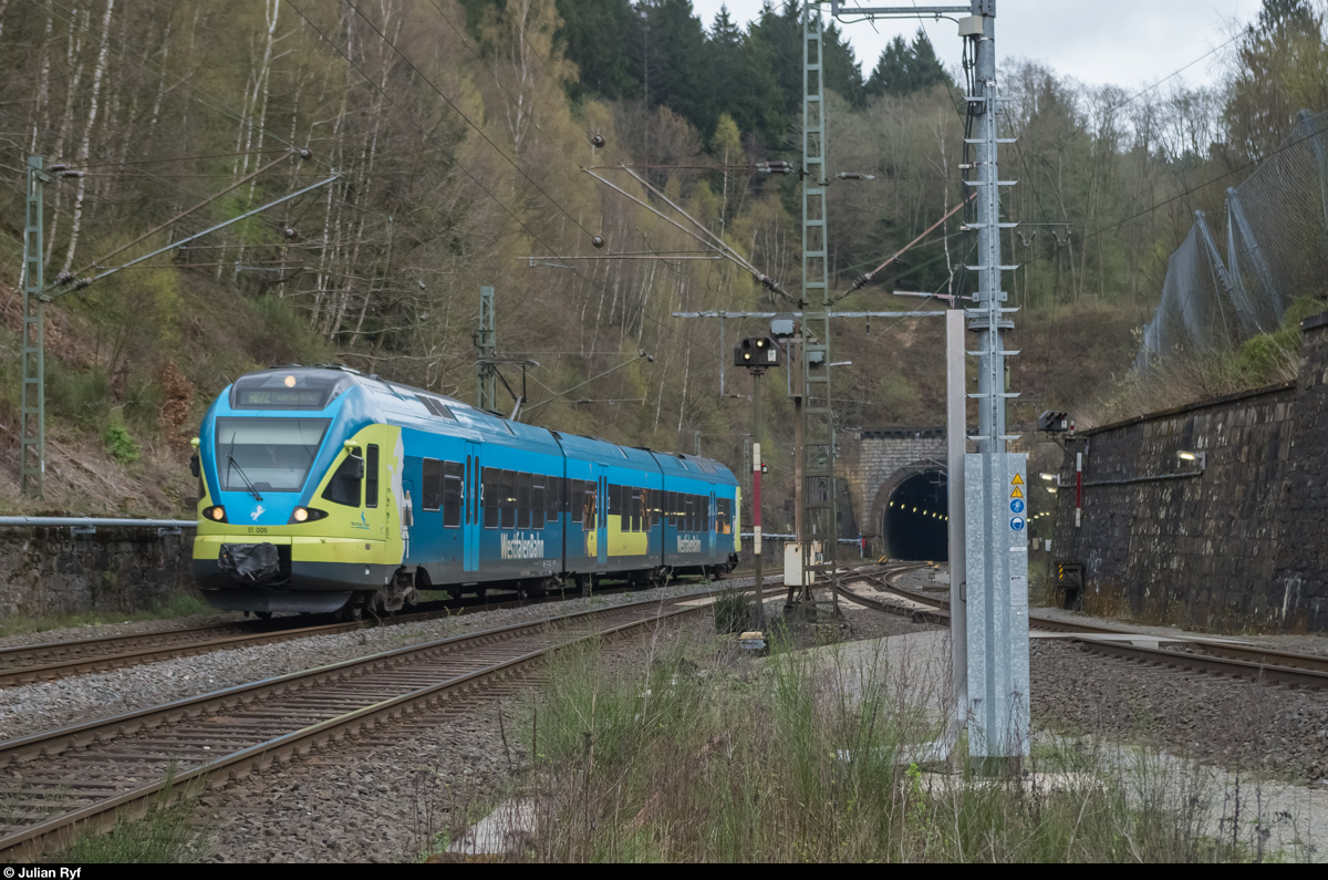Westfalenbahn ET 006 erreicht am 17. April 2016 als RB 72 nach Paderborn Hbf den Bahnhof Altenbeken. Hier bei der Ausfahrt aus dem Rehbergtunnel. Nach rechts geht die Umfahrungsstrecke weg in Richtung Kassel. Julian Ryf