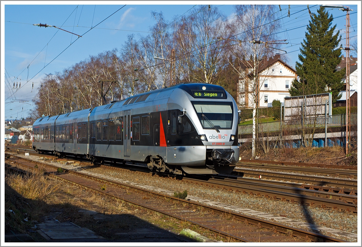 Der ET 23 002 "Märkischer Kreis" der Abellio Rail NRW GmbH (3-teiliger Stadler Flirt EMU 2 bzw. BR 0427), als RE 16 "Ruhr-Sieg-Express" (Essen - Hagen - Siegen), hat am 02.02.2014 den Bahnhof Kreuztal verlassen und rauscht weiter in Richtung Siegen.