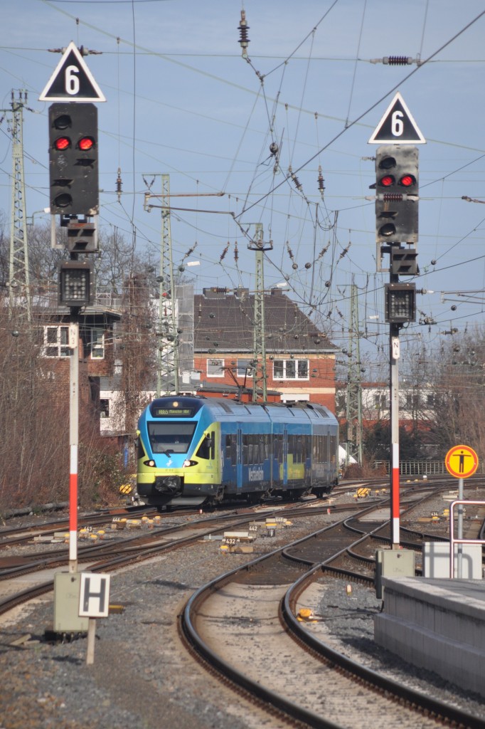 ET 23006 "Plettenberg" (ein 3-teiliger Stadler Flirt) der Abellio Rail NRW hat gerade (am15.03.2014) im Bahnhof Siegen-Weidenau verlassen, und fährt als RE 16 "Ruhr-Sieg-Express" die Verbindung Siegen - Kreuztal - Finnentrop - Hagen - Essen. Armin Schwarz
