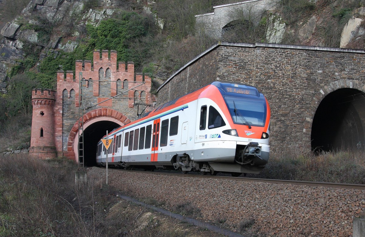 Der ET 23 009 "Kreis Siegen-Wittgenstein" der Abellio Rail NRW GmbH (3-teiliger Stadler Flirt EMU 3 bzw. BR 0427), als RE 16 "Ruhr-Sieg-Express" (Essen - Hagen - Siegen), hat am 02.02.2014 den Bahnhof Kreuztal verlassen und rauscht weiter in Richtung Siegen.