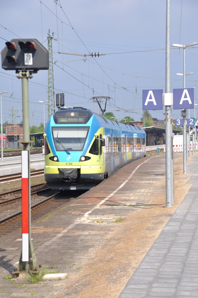 RHEINE (Kreis Steinfurt), 19.05.2013, ET 008 als RB 65 nach Münster/Westf. Hbf an Gleis 3; wg. Bauarbeiten am Bahnsteig erfolgt der Einstieg im vorderen Teil des Bahnsteigs Reinhard Zabel