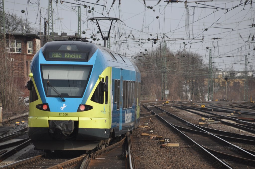 NAch einer weitläufigen Böschungs-Rodungs-Aktion von Seiten der Bahn kann man nun auch von jenseits des Bü Eltmannshausen/Oberhone bis hinunter in den Bahnhof Eschwege West schauen. Hier überquert gerade 427 551 als R7 mach Bebra den Bü in Richtung Bebra. Aufgenommen am 03.03.2011. Jens Baumhauer