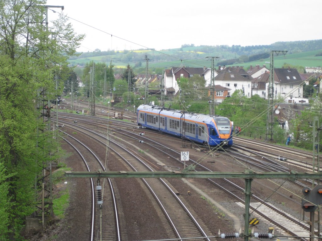 427 003 kann endlich mal wieder wie früher auf der Hauptstrecke zwischen Wehretal-Reichensachsen und Bad Sooden-Allendorf durchrauschen, da am 24.10.2010 der Halt und somit die Einfahrt in den Stadtbahnhof Eschwege entfielen. Hier beim passieren von Eschwege West. Jens Baumhauer