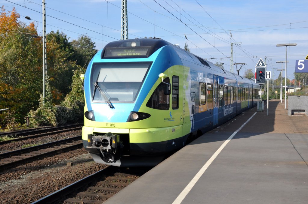 Der dreiteilige Flirt 427 041 und sein fünfteiliger Bruder 429 543 der Hessischen Landesbahn machen sich am 10.10.2010 mit Eisenbahnern besetzt in Elstal auf zur Probefahrt, während im Hintergrund die Hälfte der Gleise mit neuen 442ern belegt ist. Raphael Krammer