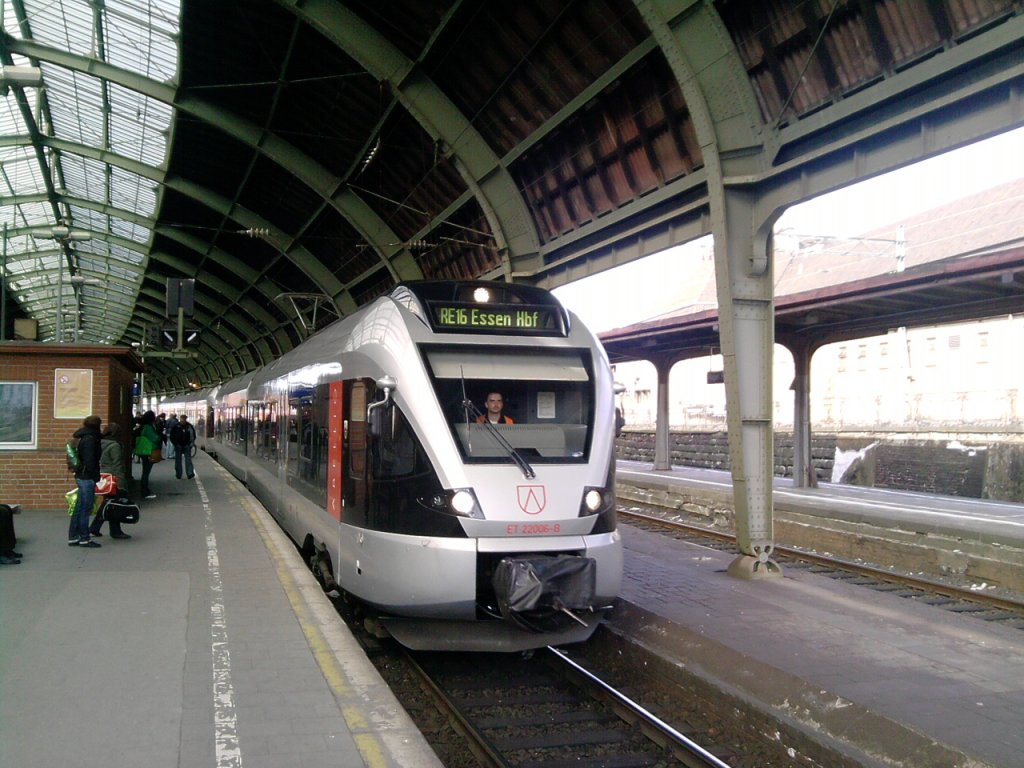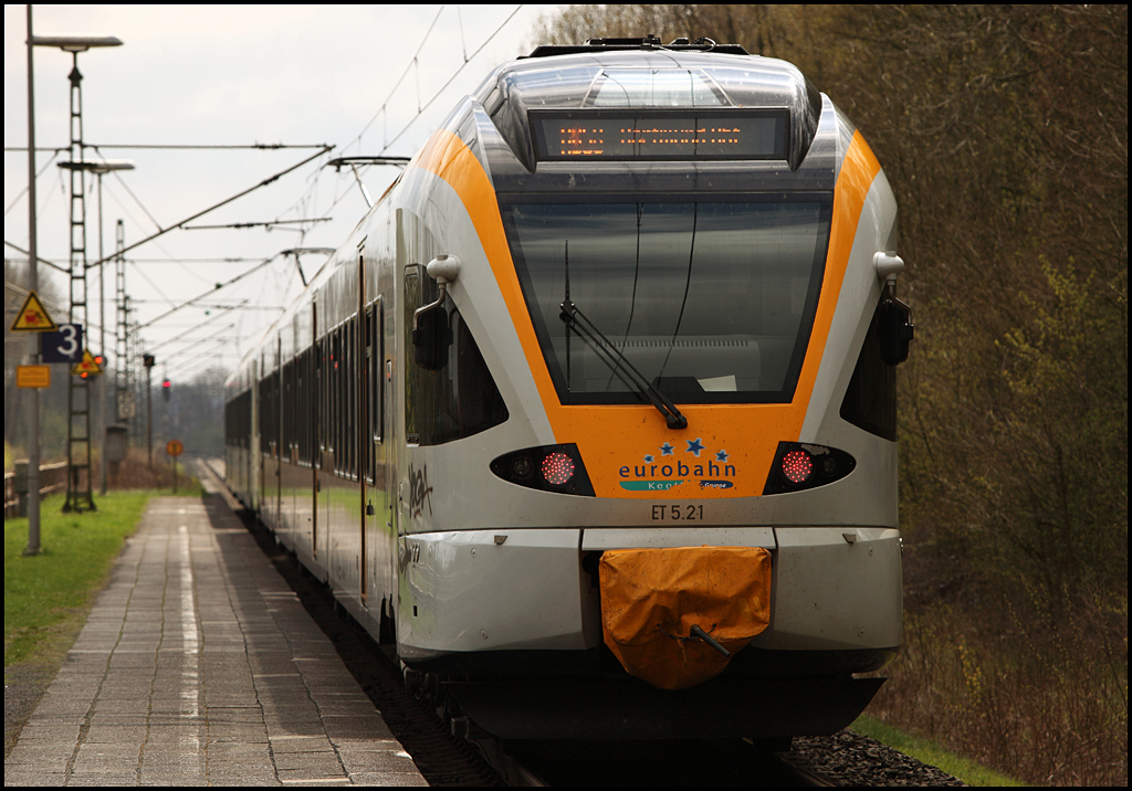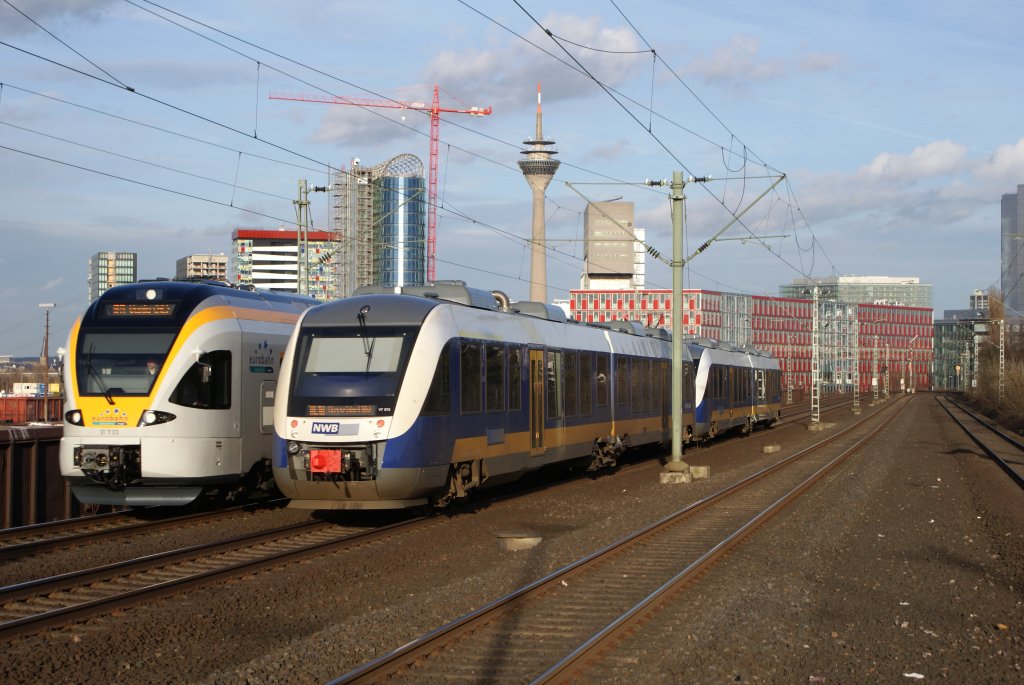 Eurobahn ET 7.03 als RE 13 nach Mönchengladbach und NWB VT 575 als RE 10 nach Düsseldorf Hbf treffen sich in Düsseldorf-Hamm am 27.02.2010 um 16:53 Uhr Gilbert C.