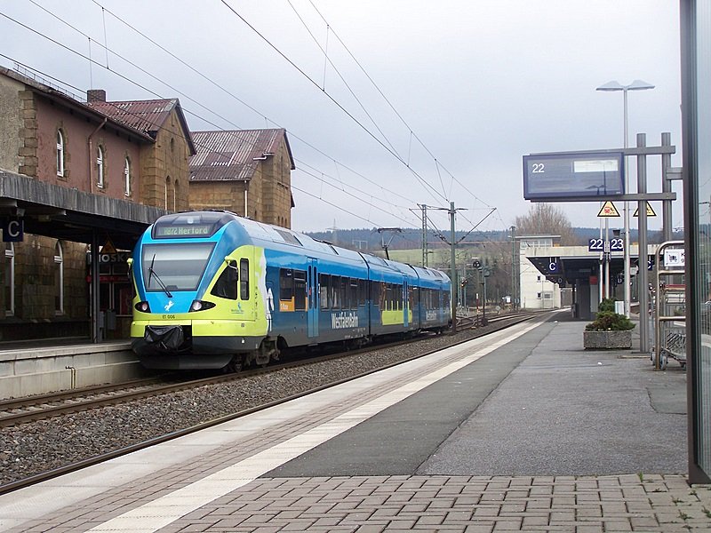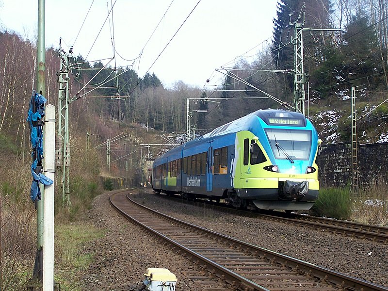 ET008 verlässt Horn Bad-Meinberg Richtung Herford und damit auch in den Regen, denn die Wolken im Hitnergrund sehen alles andere als freundlich aus. 18.03.08 Florian Derwarf
