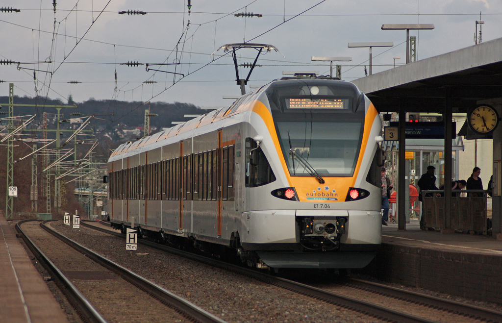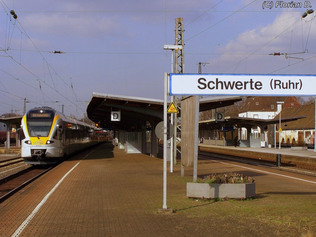 RE9023 (RE13 "Mass-Wupper-Express"), aus Mönchengladbach Hbf kommend, bei einem Halt in Schwerte an der Ruhr am 23.03.2010. Kurz nach der Abfahrt strebt der ET 7.07 weiter seinem Zeil "Hamm(Westf)" entgegen. Florian Derwarf