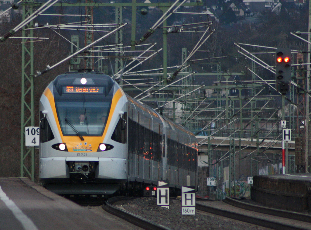 Der RE13 "Maas-Wupper-Express", bestehend aus ET 7.10 und 7.04, kommt gerade von Hamm(Westf) und fährt auf seinem Weg nach M'Gladbach in Wuppertal-Vohwinkel ein. 23.03.2010 Florian Derwarf