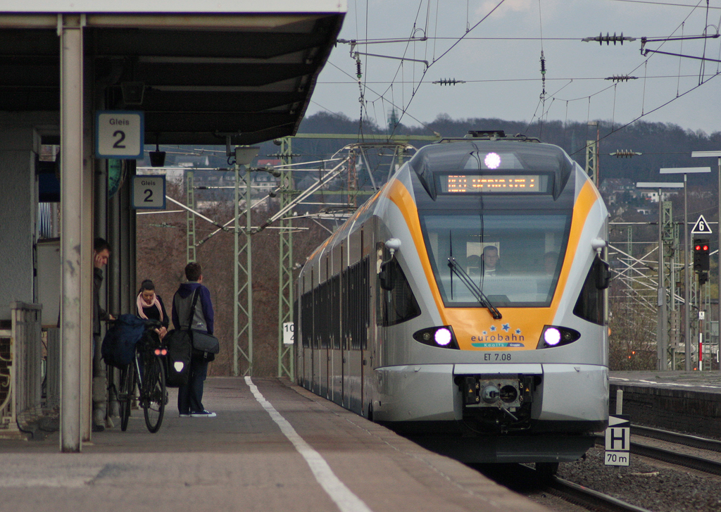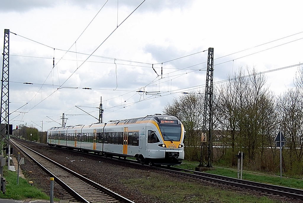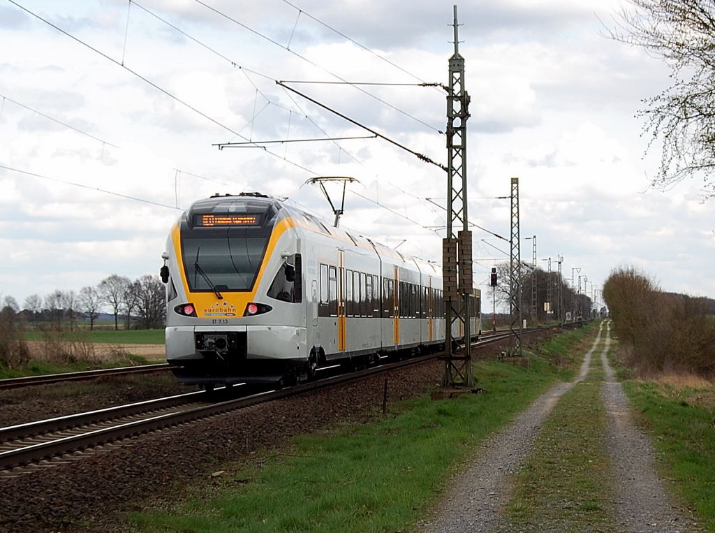 Nachschuß auf den ET 7.13 der Eurobahn, soeben hat er den Bahnhof Boisheim verlassen und der nächste Halt auf der Strecke ist Dülken.2.4.2010 Andreas Strobel