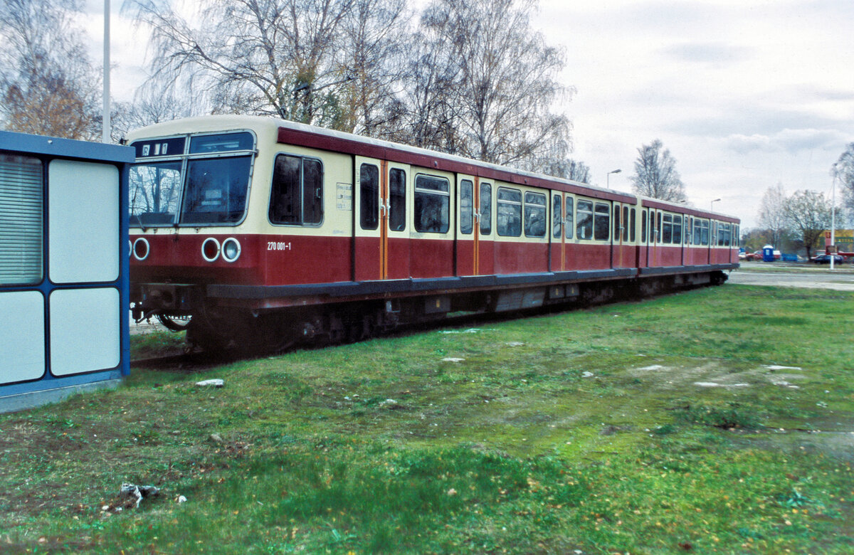 Dort. wo er 1979 von LEW Hennigsdorf gebaut wurde, stand am 05.11.1998 auf dem Werksgelände der Firma Adtranz (Bombardier) der S-Bahn-Baumusterzug der DR 270 001 mit Beiwagen 002 als Ausstellungsobjekt des Vereins Historische S-Bahn Berlin. Ernst Lauer