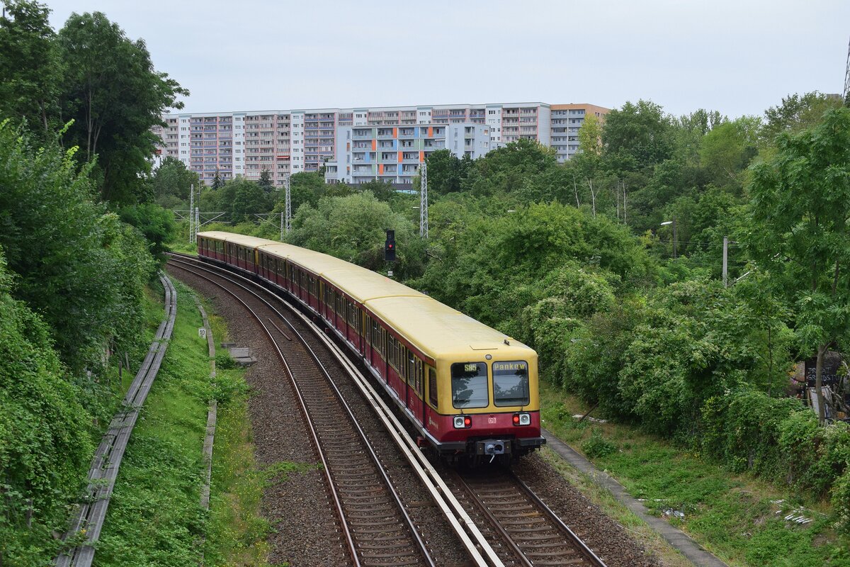 Nachschuss auf einen unbekannten 485er als S85 nach Pankow zwischen Frankfurter Allee uund Storkower Straße von der Eldenaer Brücke aus.
