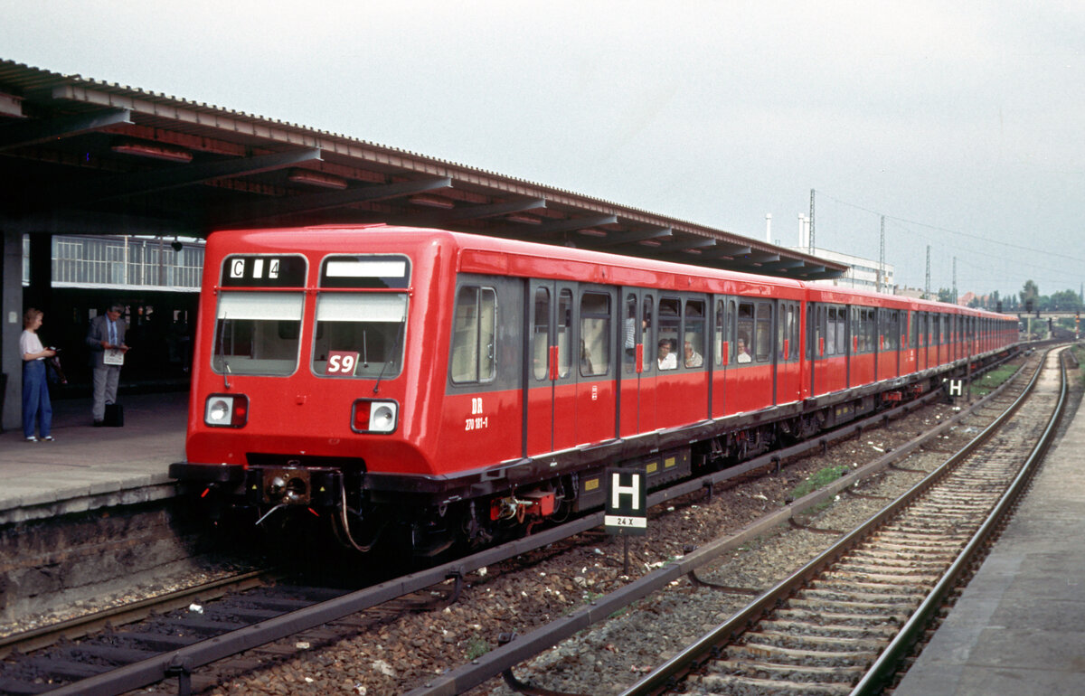 Der DR S-Bahn-Triebwagen 270 063 in der bei der Berliner S-bahn unüblichen rot/schwarzen Lackierung am 13.11.1990 beim Verlassen des Berliner Bf. Warschauer Straße. Ernst Lauer