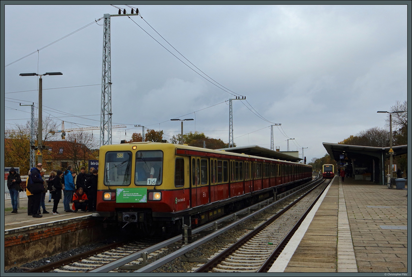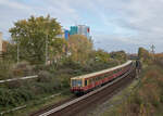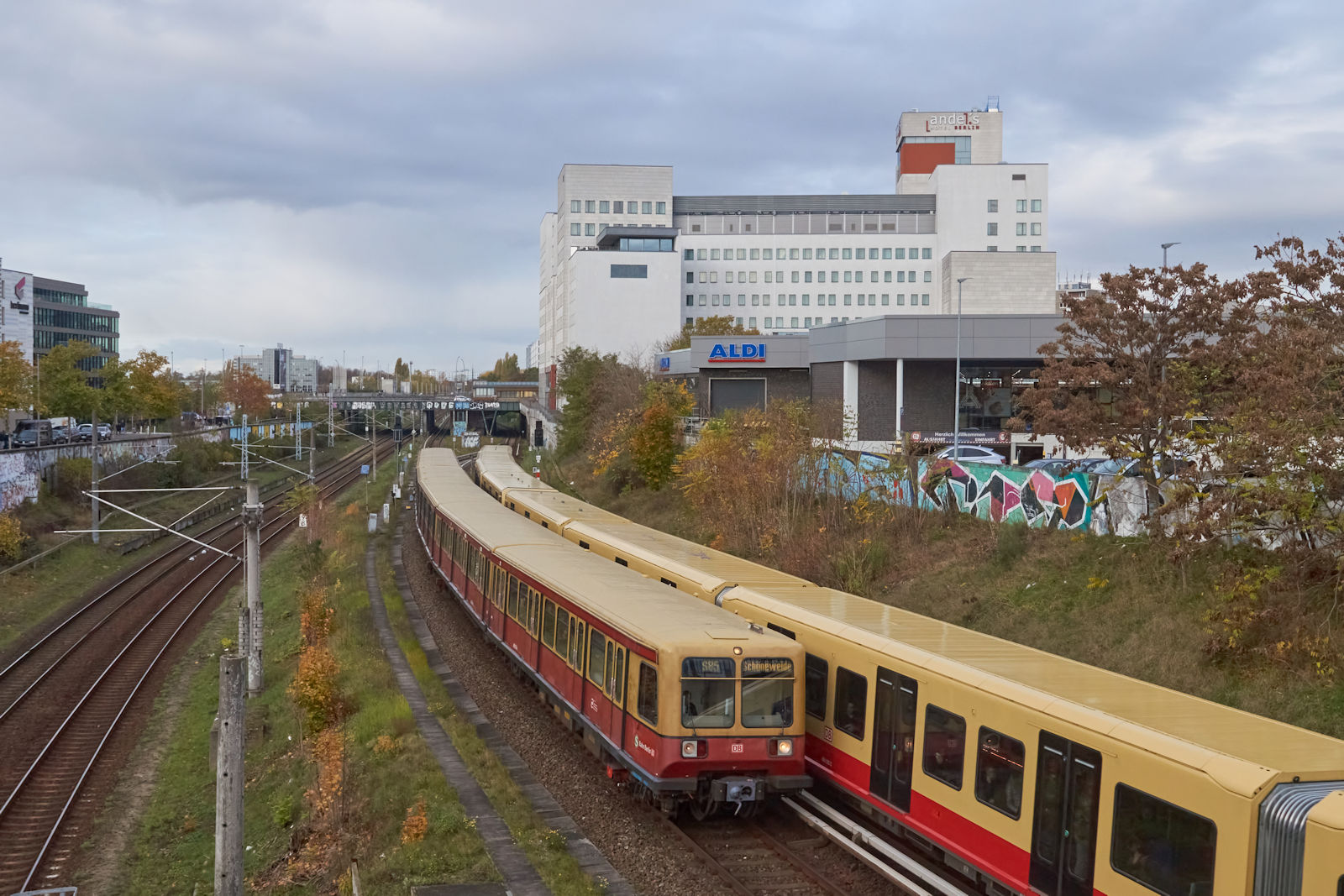 485 038 war am 11.11.2023 an der Spitze eines Dreiviertelzuges auf der Linie S85 vom Pamkow nach Schöneweide unterwegs. In Kürze erreicht der Zug den Bahnhof Landsberger Allee. Michael Brunsch