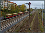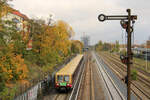 Am vorletzten EInsatztag führt 485 038 einen Dreiviertelzug der Baureihe 485 auf der Linie S85. Am Stellwerk Swn vorbei, fährt der Zug in den Bahnhof Schöneweide ein. (11.11.2023) Michael Brunsch
