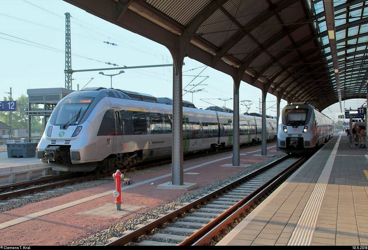 1442 103 (Bombardier Talent 2) der S-Bahn Mitteldeutschland (DB Regio Südost) als S 37315 (S3) nach Leipzig-Connewitz trifft auf 1442 ??? (MDSB II) als S 37814 (S8) nach Dessau Hbf in ihrem Startbahnhof Halle(Saale)Hbf in morgendlichem Licht.