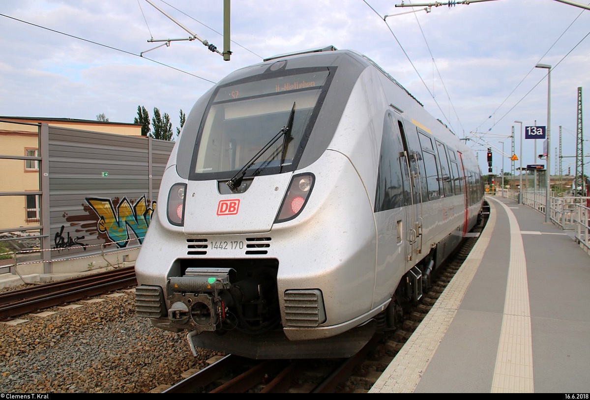 1442 170 (Bombardier Talent 2) der S-Bahn Mitteldeutschland (MDSB II | DB Regio Südost) als S 37762 (S7) nach Halle-Nietleben steht in ihrem Startbahnhof Halle(Saale)Hbf Gl. 13a.