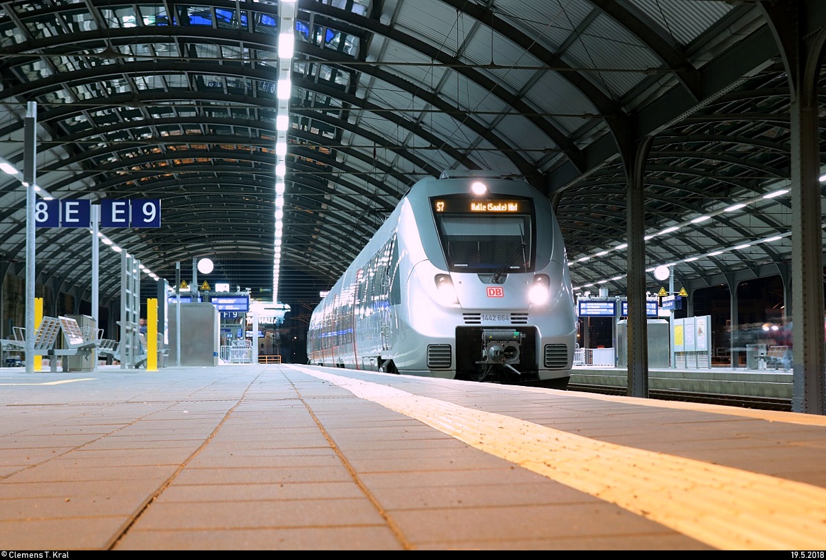 Der außerplanmäßig eingesetzte 1442 664 (Bombardier Talent 2) der S-Bahn Mitteldeutschland (MDSB II | DB Regio Südost) als S 37772 (S7) nach Halle-Nietleben steht in ihrem Startbahnhof Halle(Saale)Hbf auf Gleis 9.