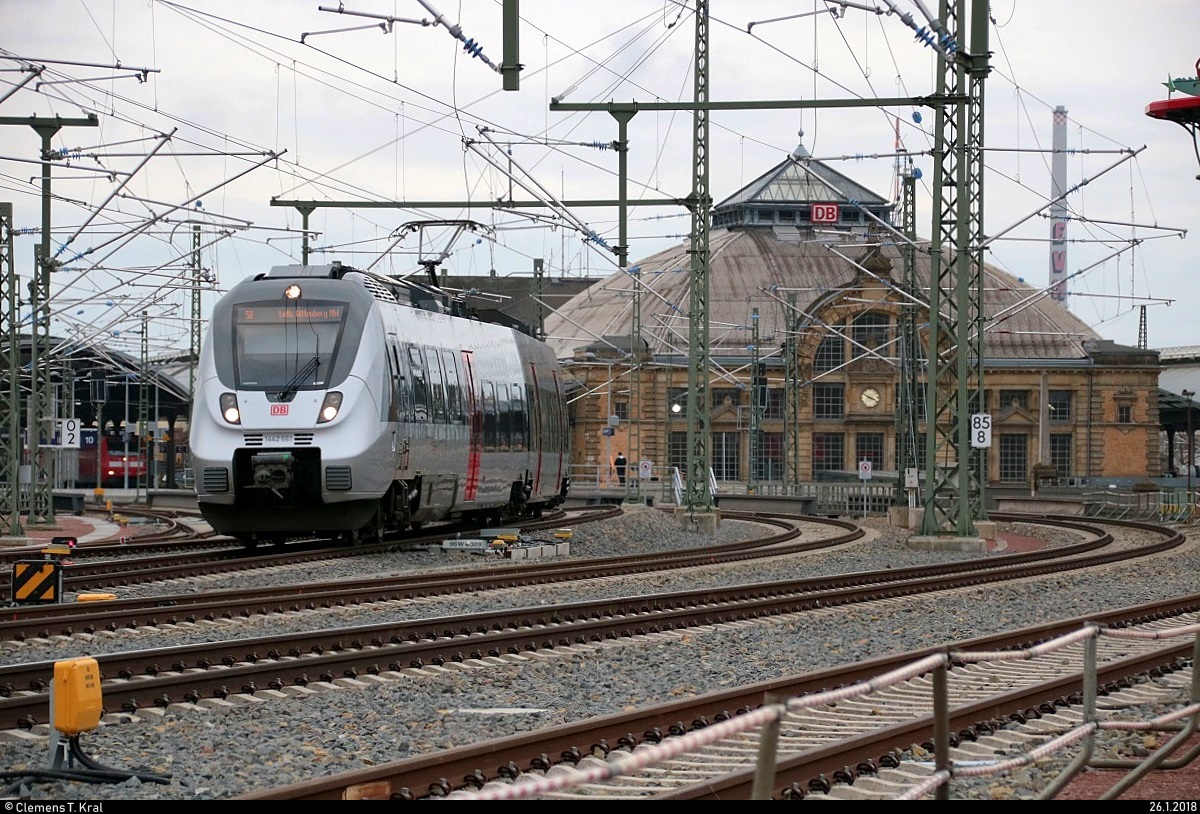 Nachschuss auf 1442 661 (Bombardier Talent 2) der S-Bahn Mitteldeutschland (MDSB II | DB Regio Südost) als S 37847 (S8) von Bitterfeld nach Halle(Saale)Hbf, die das Gleisvorfeld von Halle(Saale)Hbf durchfährt. Aufgenommen von der Delitzscher Straße. [26.1.2018 | 15:40 Uhr] Clemens Kral