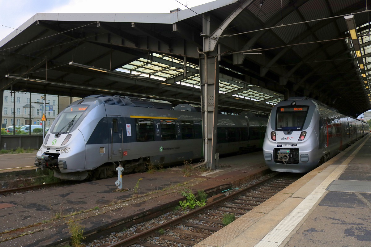 1442 213 und 1442 610 (Bombardier Talent 2) der S-Bahn Mitteldeutschland als S 37353 (S3) von Halle(Saale)Hbf nach Geithain treffen auf 9442 618 und 9442 607 (Bombardier Talent 2) von Abellio Rail Mitteldeutschland als RE 74711 (RE9) von Kassel-Wilhelmshöhe nach Bitterfeld in Halle(Saale)Hbf auf den Gleisen 2 und 3. [26.8.2017 - 17:02 Uhr] Clemens Kral